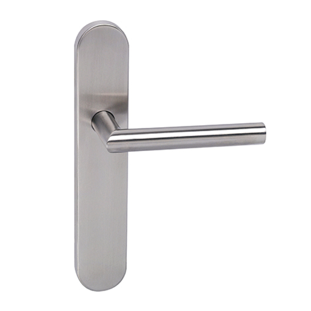 Juego de placa ovalada estrecha en acero inoxidable para puertas de madera de interior o exterior. Referencias: MVI-503 Material: Acero Inoxidable Acabados: Inoxidable Dimensión A: 30...