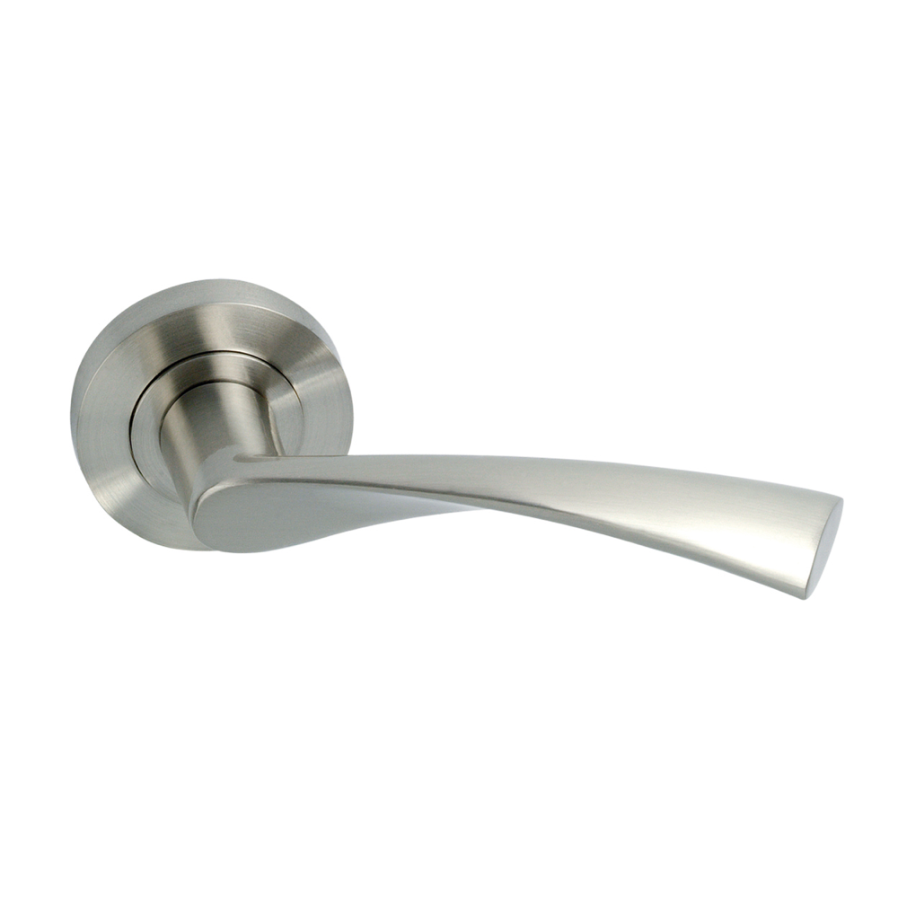 Juego de roseta redonda acabado en níquel satinado para puertas de madera de interior. Referencia: R-130 Material: Zamak Acabado: Níquel Satinado Dimensión A: 52 Dimensión B:...