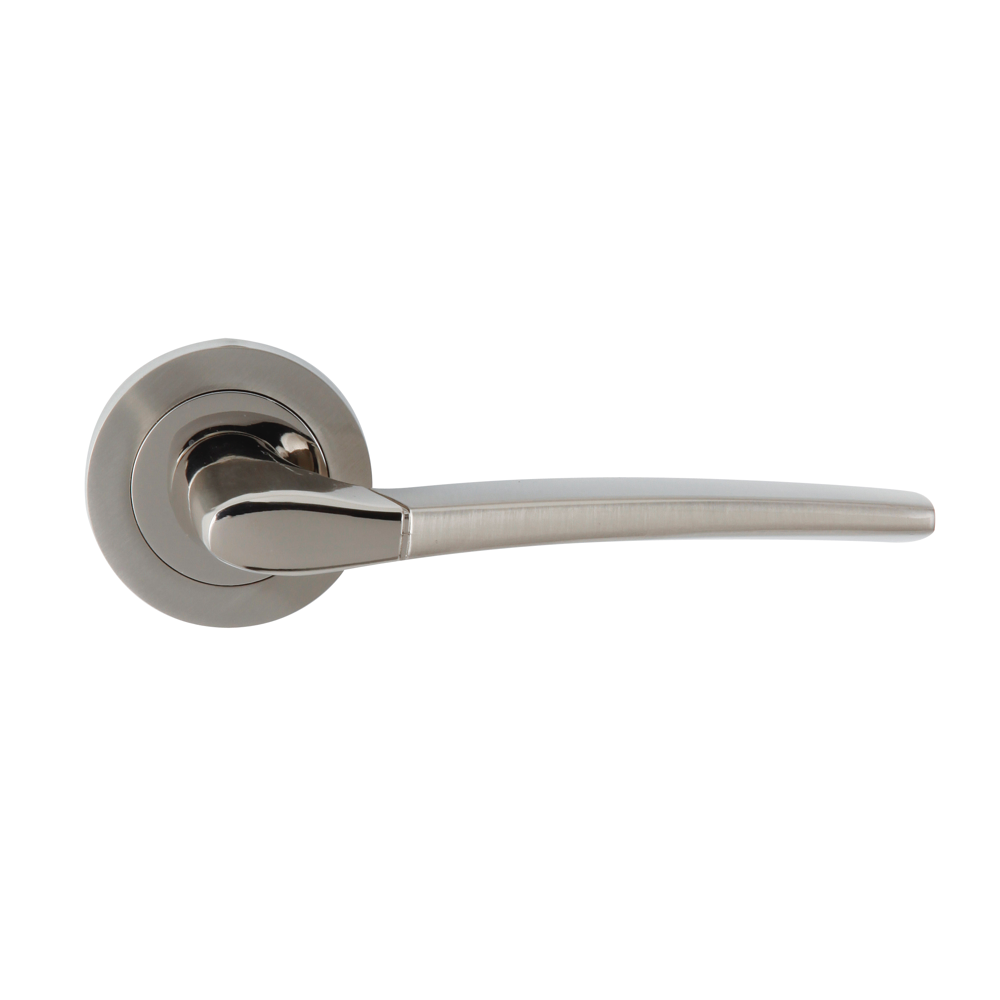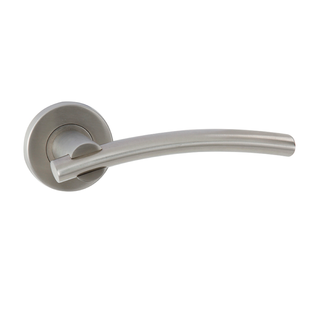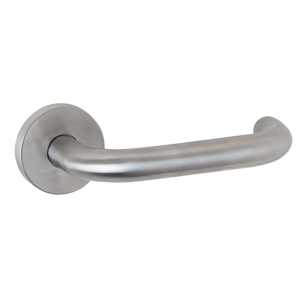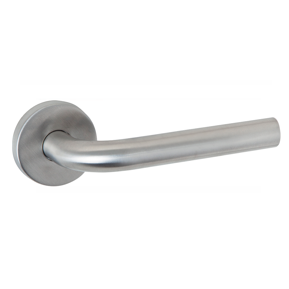 Manilla de roseta redonda de zamak con acabado en níquel satinado para puerta. Referencia: R-250 Material: Zamak Acabado: Níquel Satinado Dimensión A: 52 Dimensión B: 140
