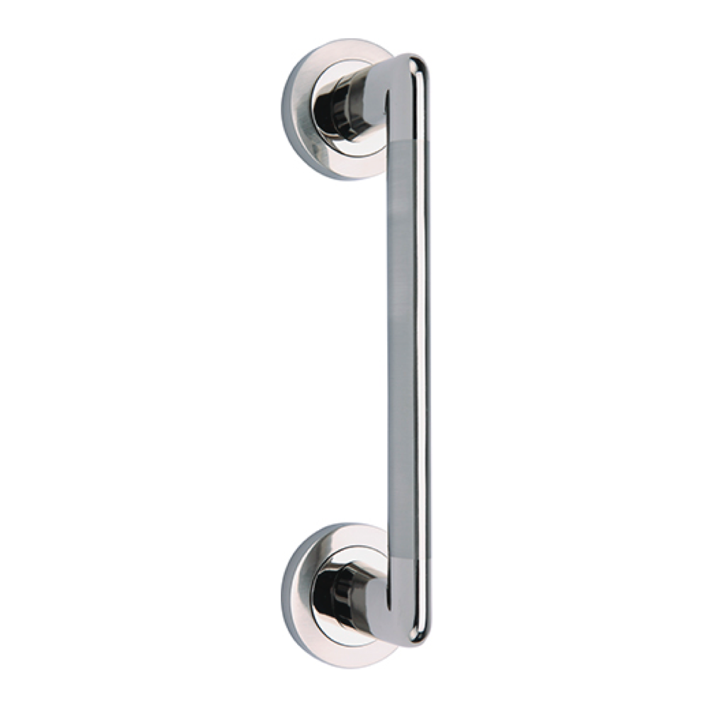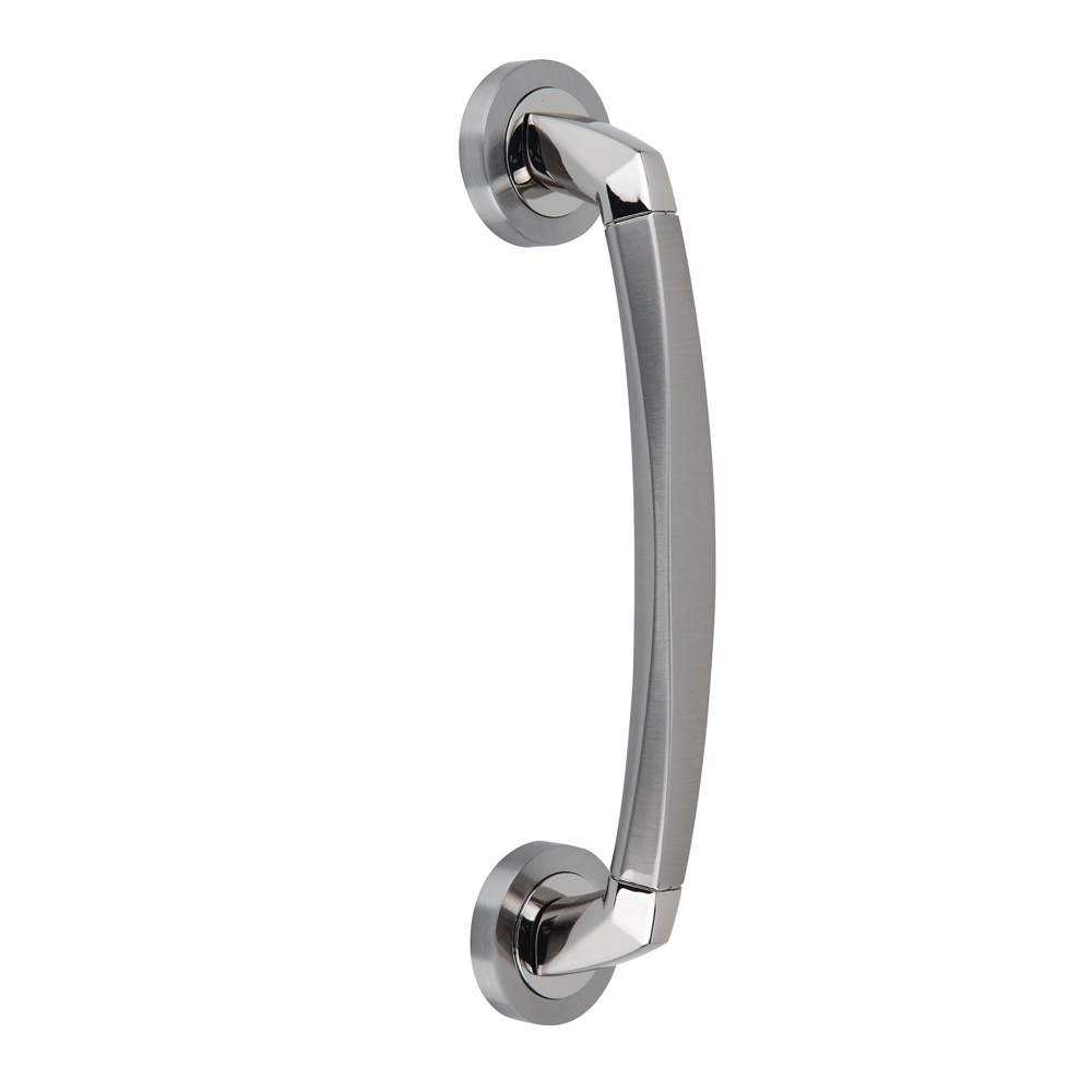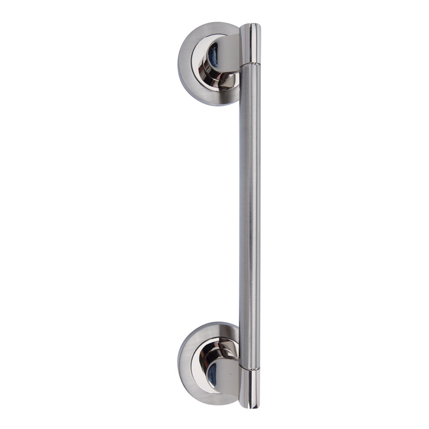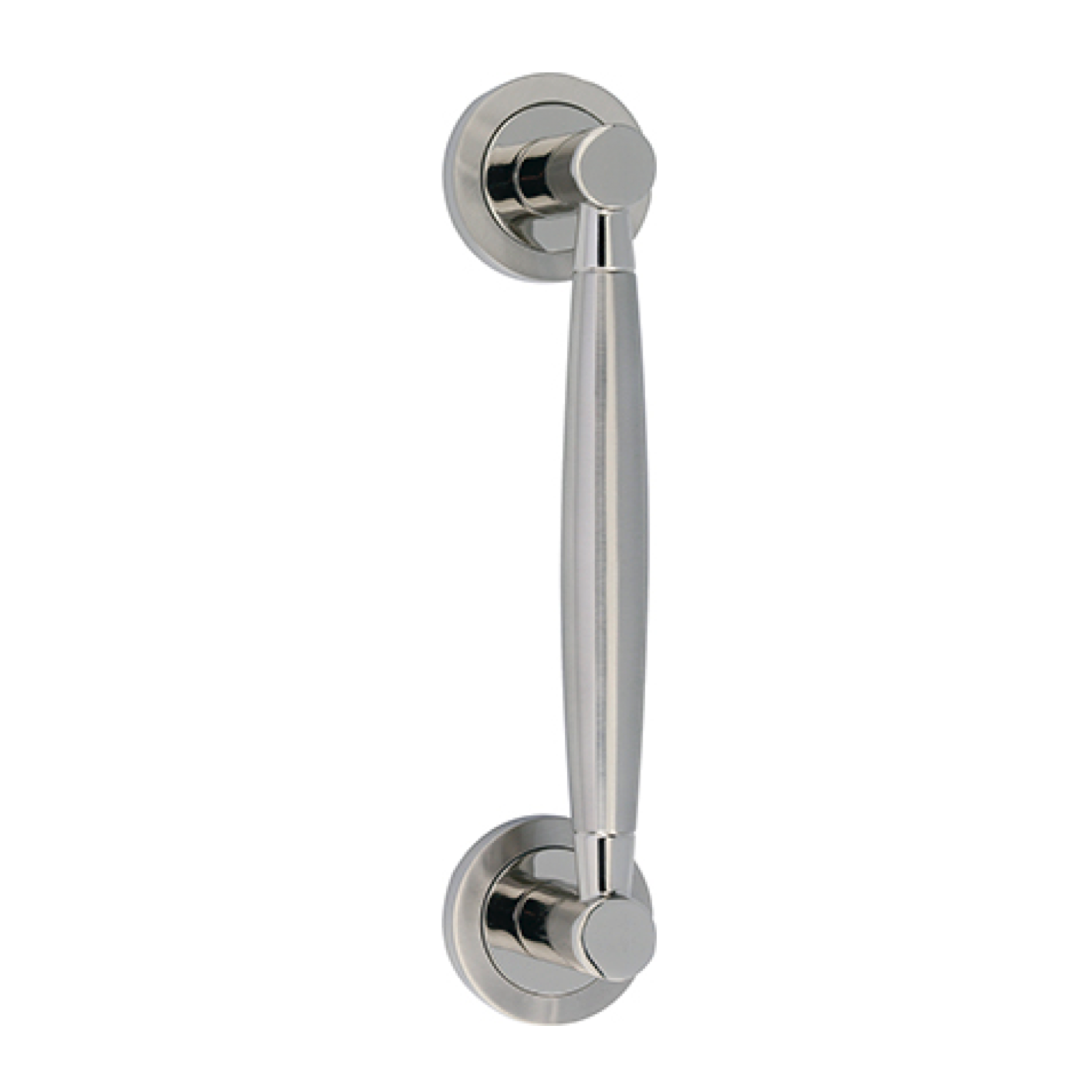 Manillón de roseta redonda de Zamak con acabado en níquel combinado para puerta. Referencia: R-324 Material: Zamak Acabado: Níquel Combinado Dimensión A: 52 Dimensión B: 220