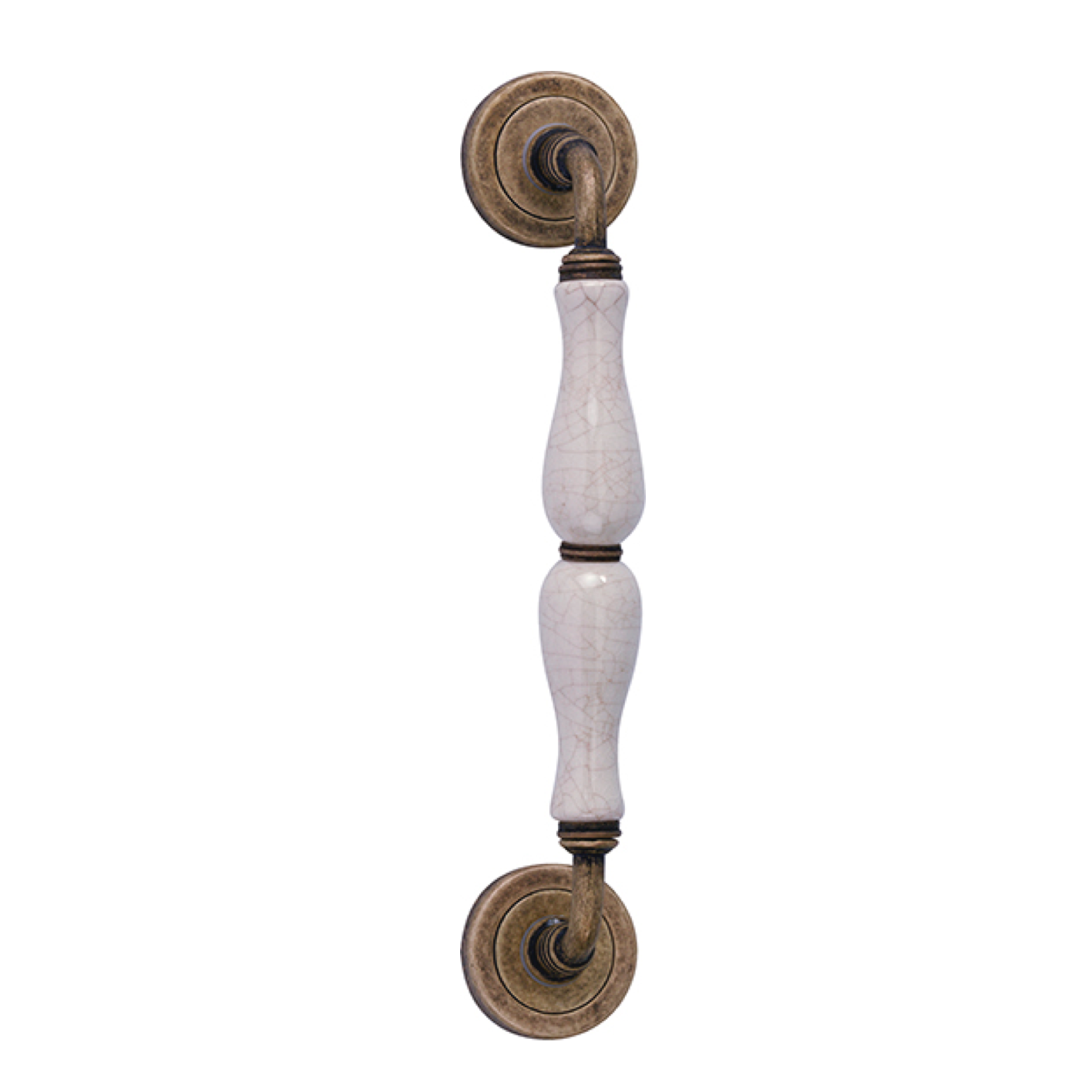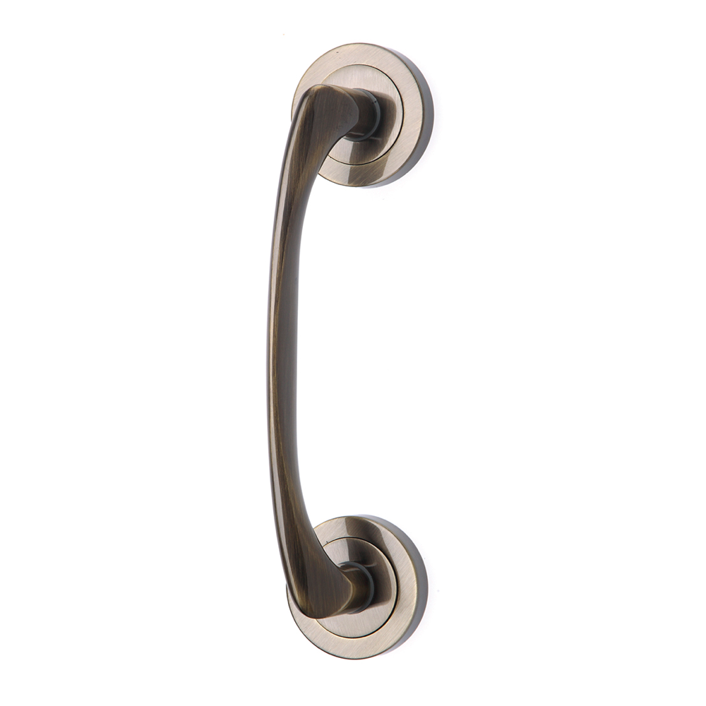 Manillón de roseta redonda de zamak con acabado en cuero envejecido para puerta. Referencia: R-4074 Material: Zamak Acabado: Cuero Envejecido Dimensión A: 52 Dimensión B: 215