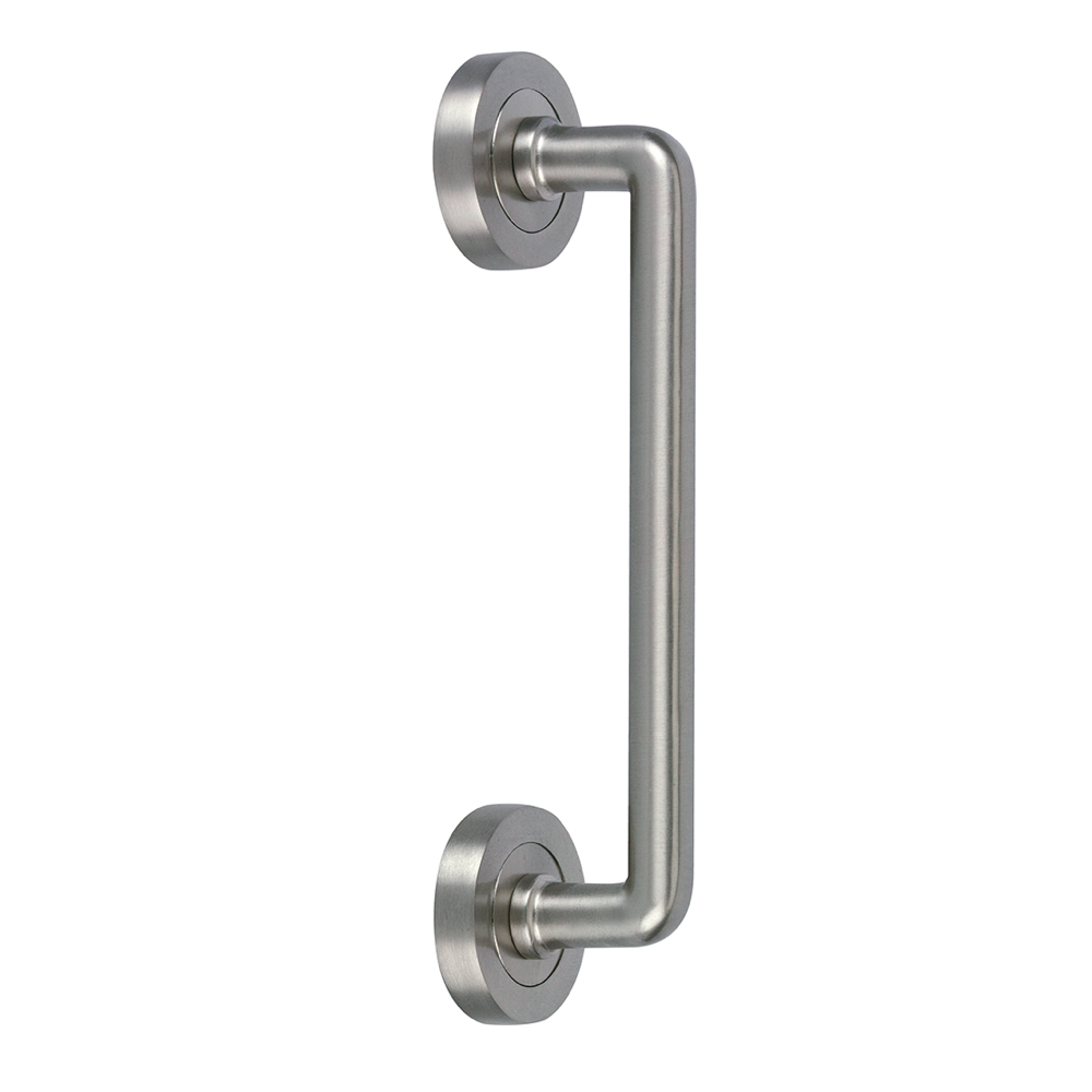 Manillón de roseta redonda de zamak con acabado en níquel satinado para puerta. Referencia: R-034 Material: Zamak Acabado: Níquel Satinado Dimensión A: 52 Dimensión B: 170