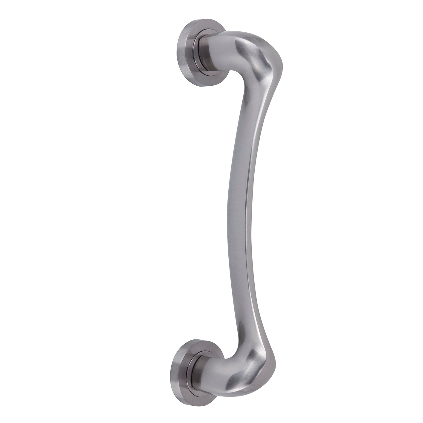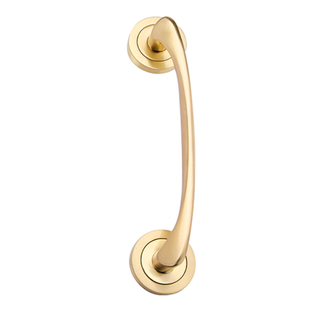 Manillón de roseta redonda en zamak con acabado en pulido satinado para puerta. Referencia: R-564 Material: Zamak Acabado: Pulido Satinado Dimensión A: 52 Dimensión B: 190