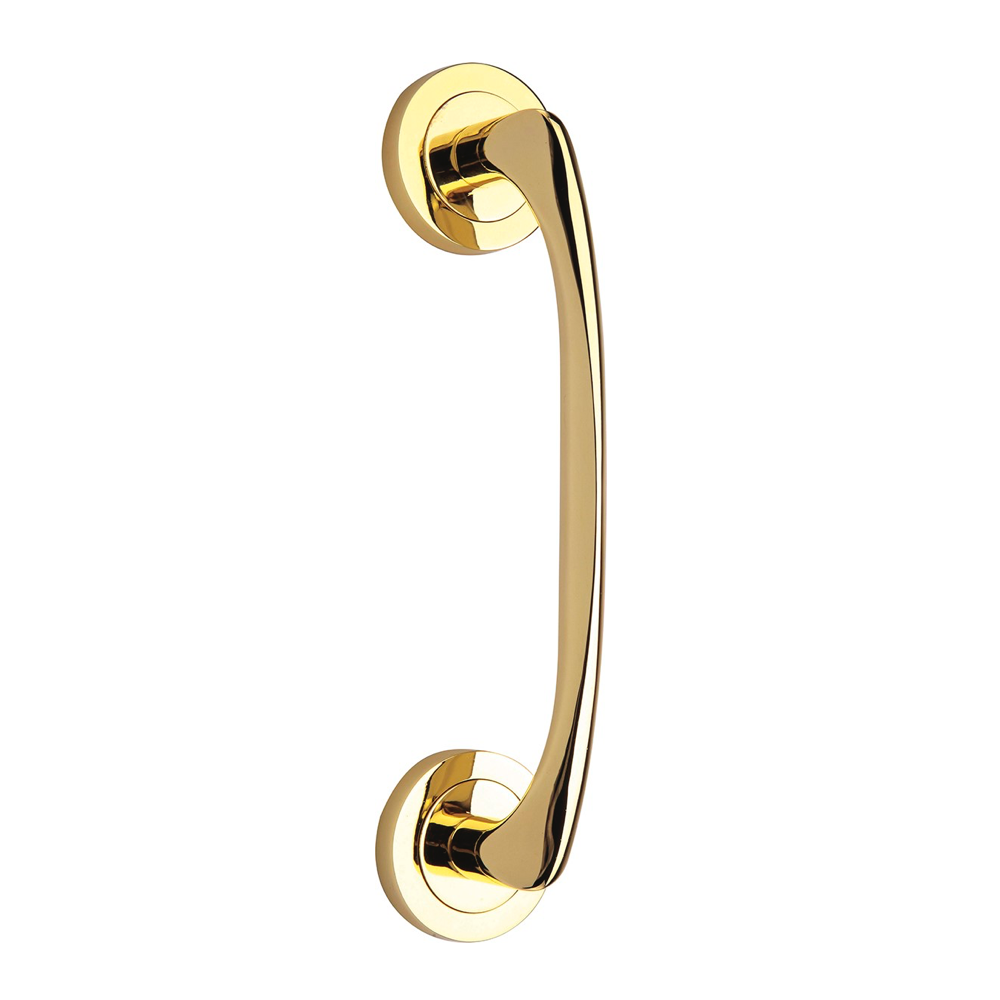 Manillón de roseta redonda acabado en latón pulido para puerta. Referencia: R-514 Material: Zamak Acabado: Latón Pulido Dimensión A: 52 Dimensión B: 190