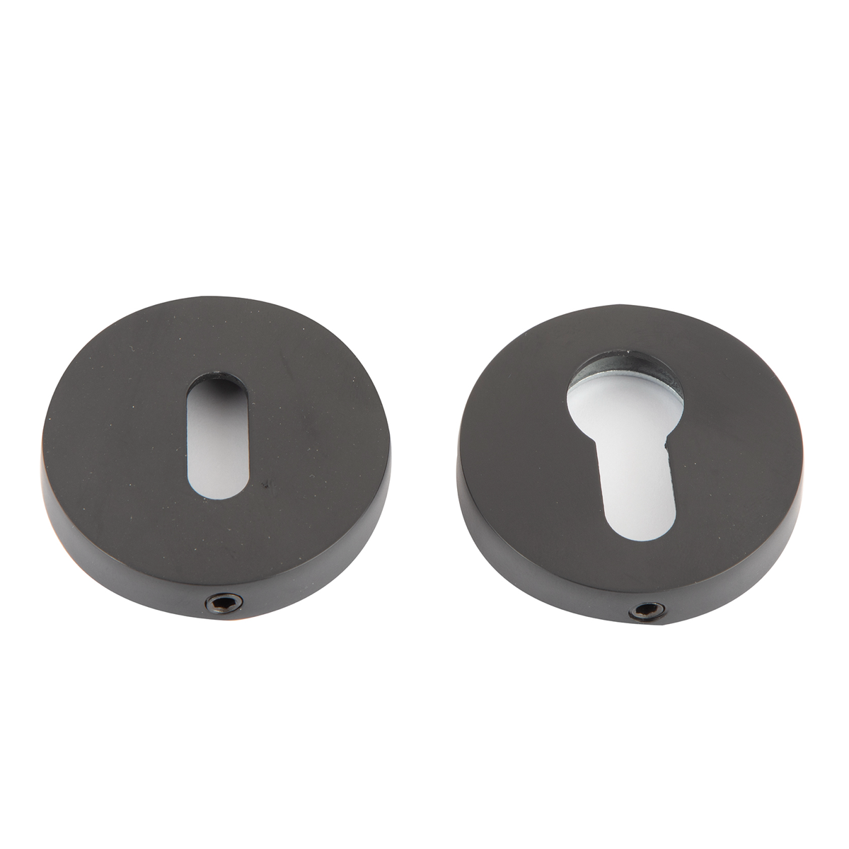 Bocallave roseta redonda oval y pera, en acabado negro para puertas. Disponible en diferentes acabados. Referencia: RS-4 N Material: Zamak Acabado: Negro Diámetro: 52