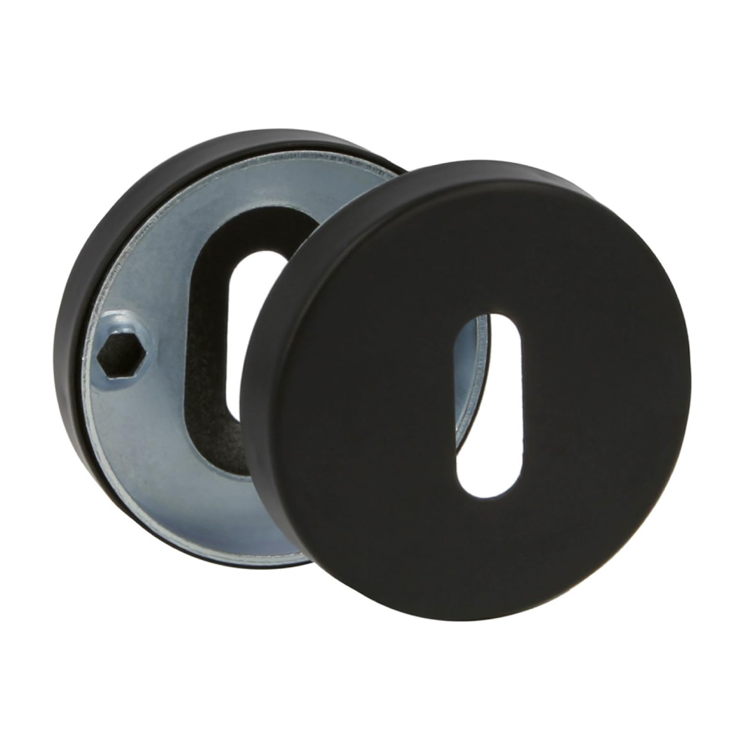 Round oval and pear rosette keyhole, in black finish for doors. Available in different finishes. Reference: R-4 N Material: Zamak Finish: Black Diameter: 52