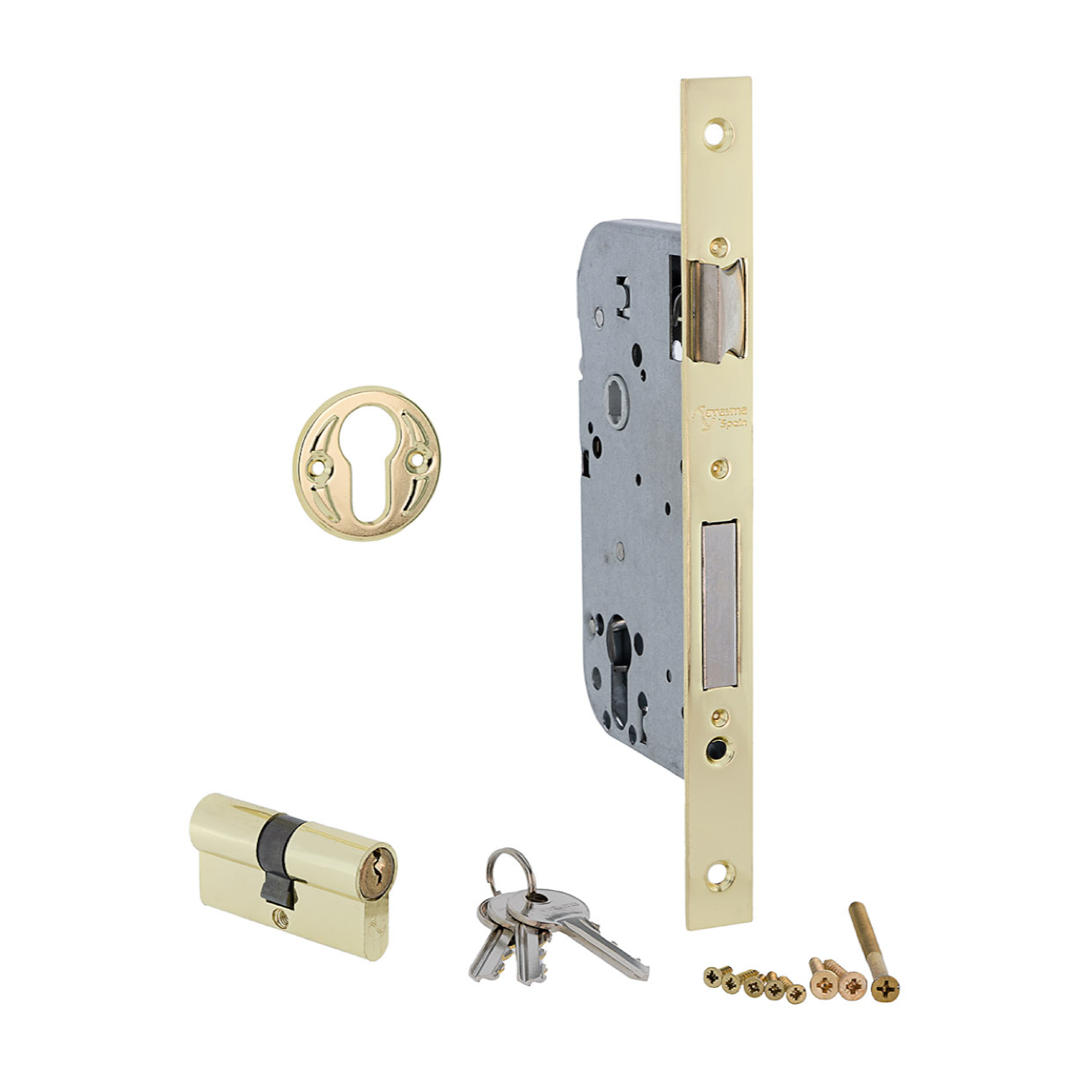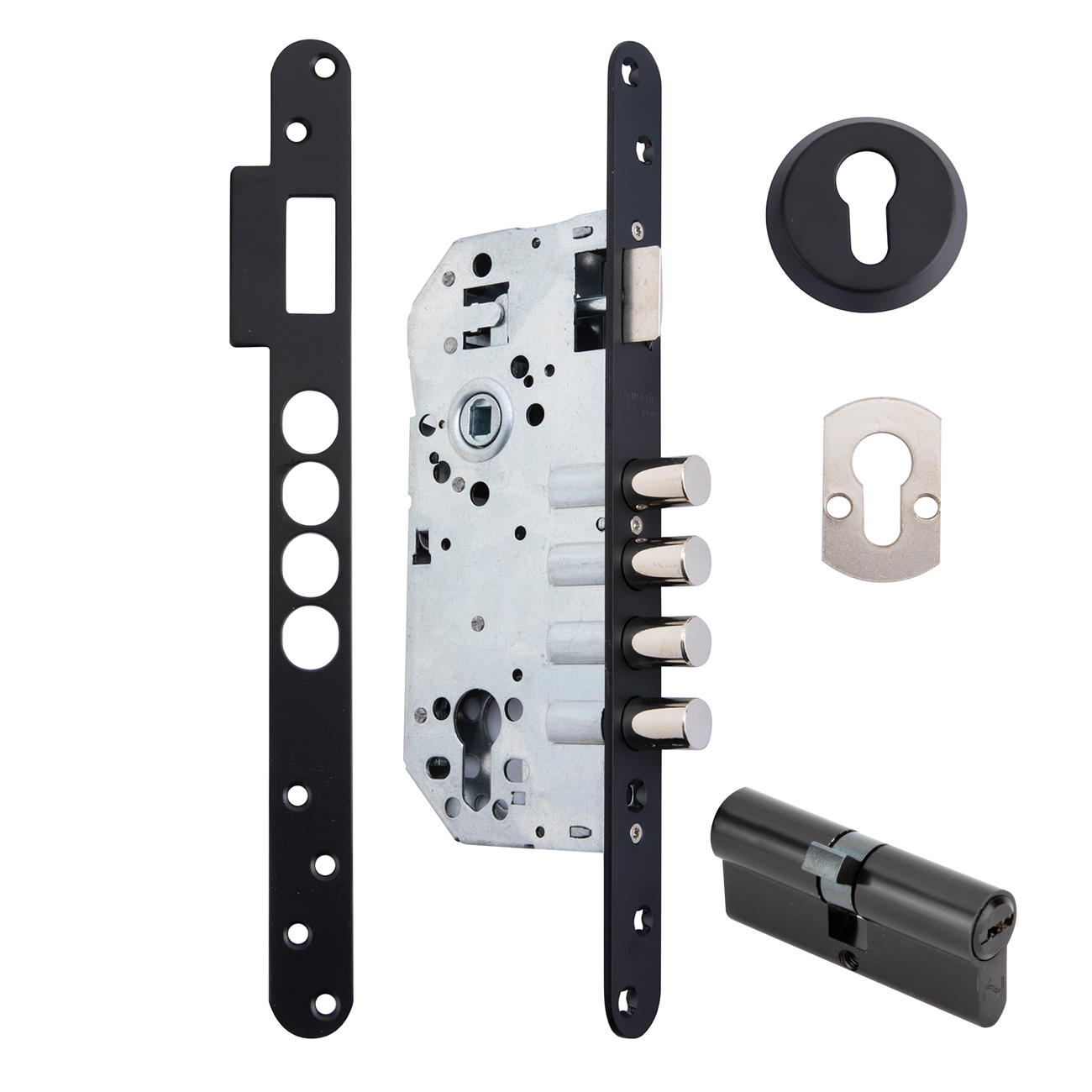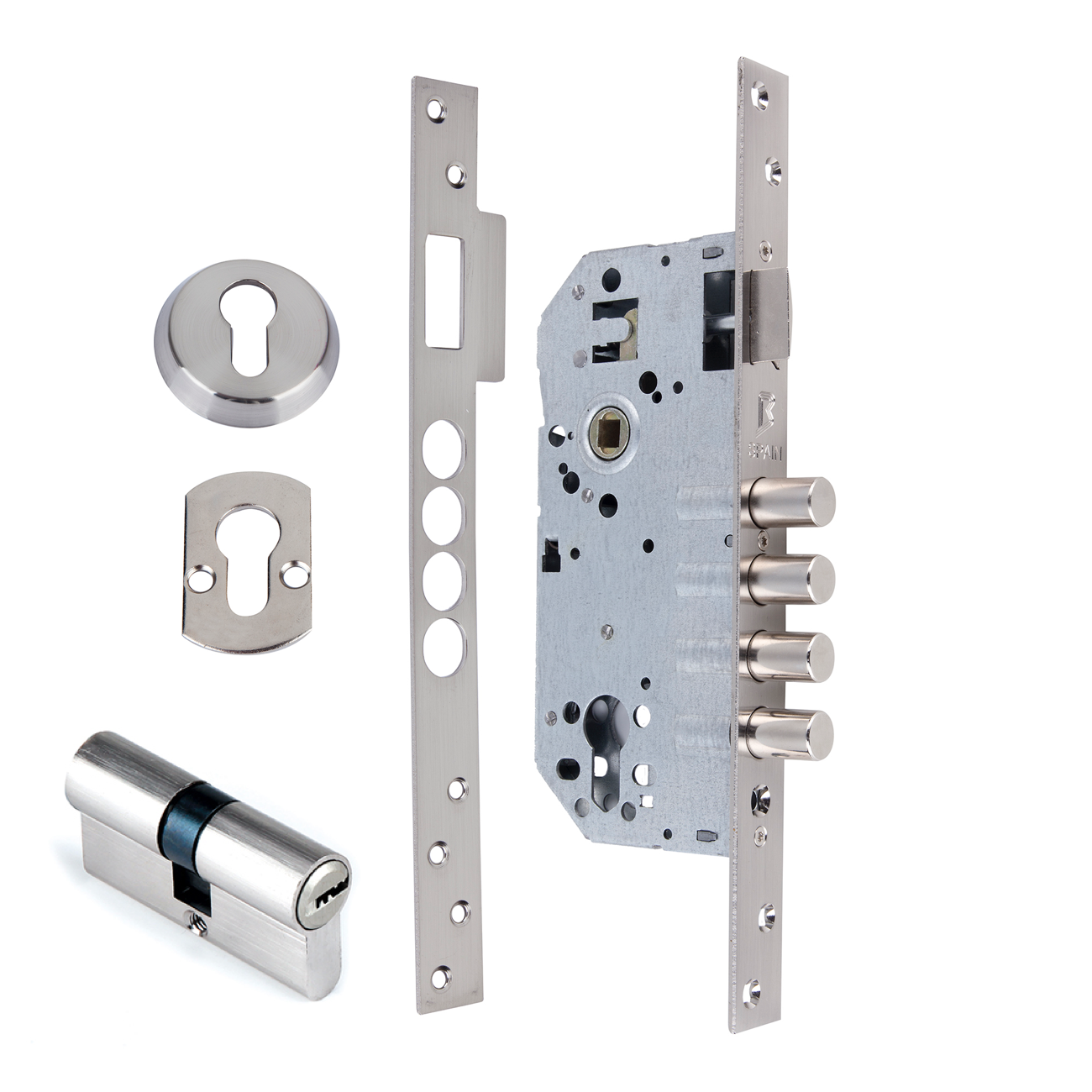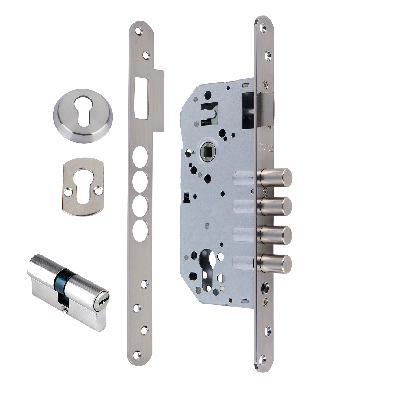 Cerradura de seguridad con 4 bulones de acero, para cilindro Europeo. Picaporte reversible de acero cromado, para entrada de 50/60mm. Frente en canto redondo o recto....