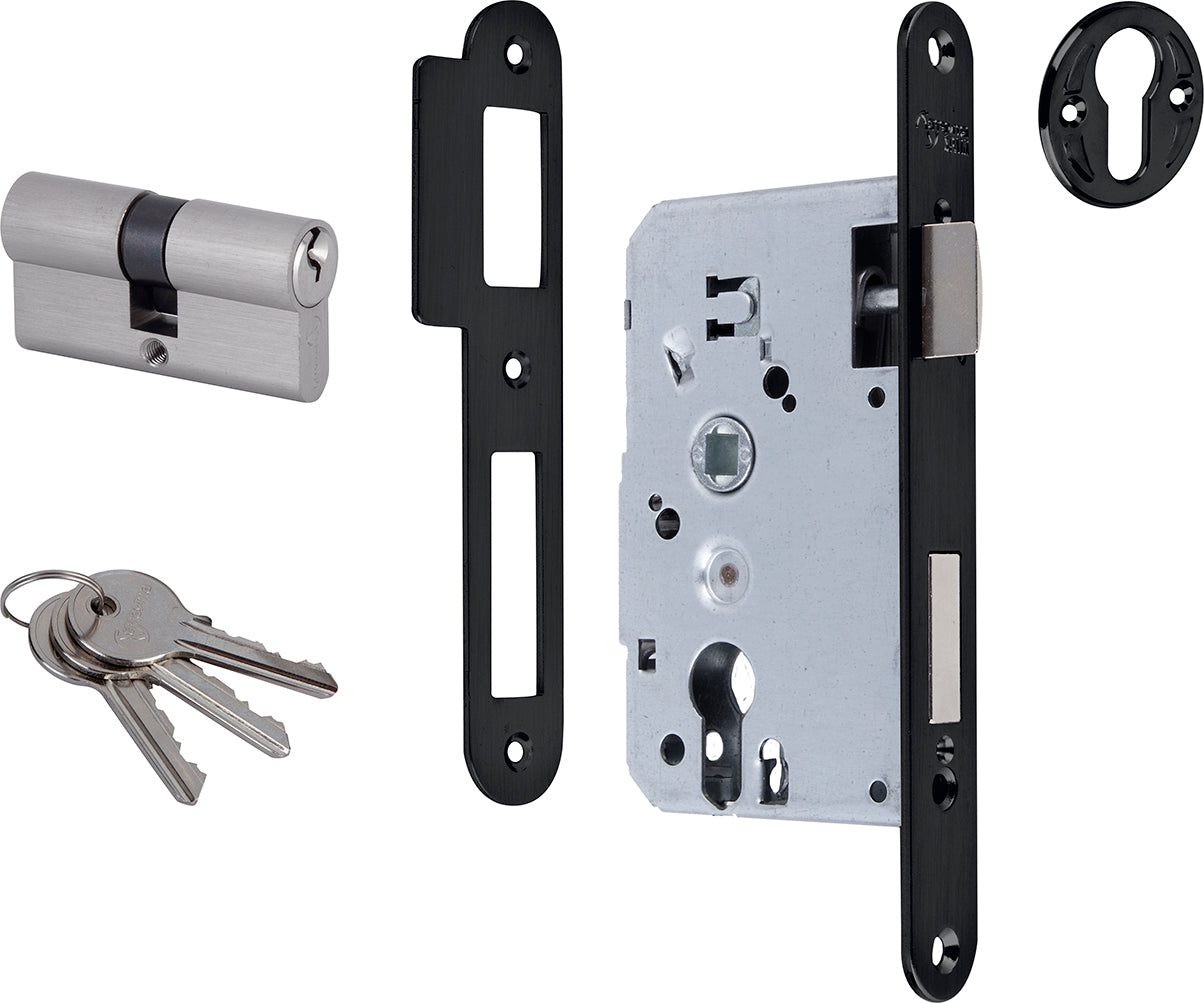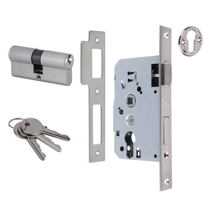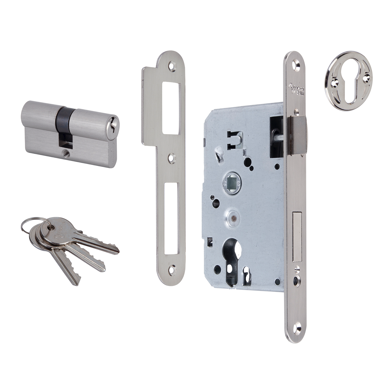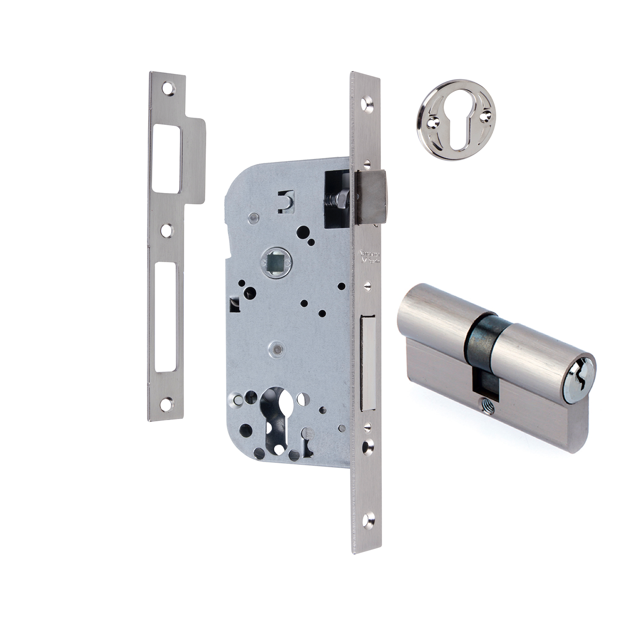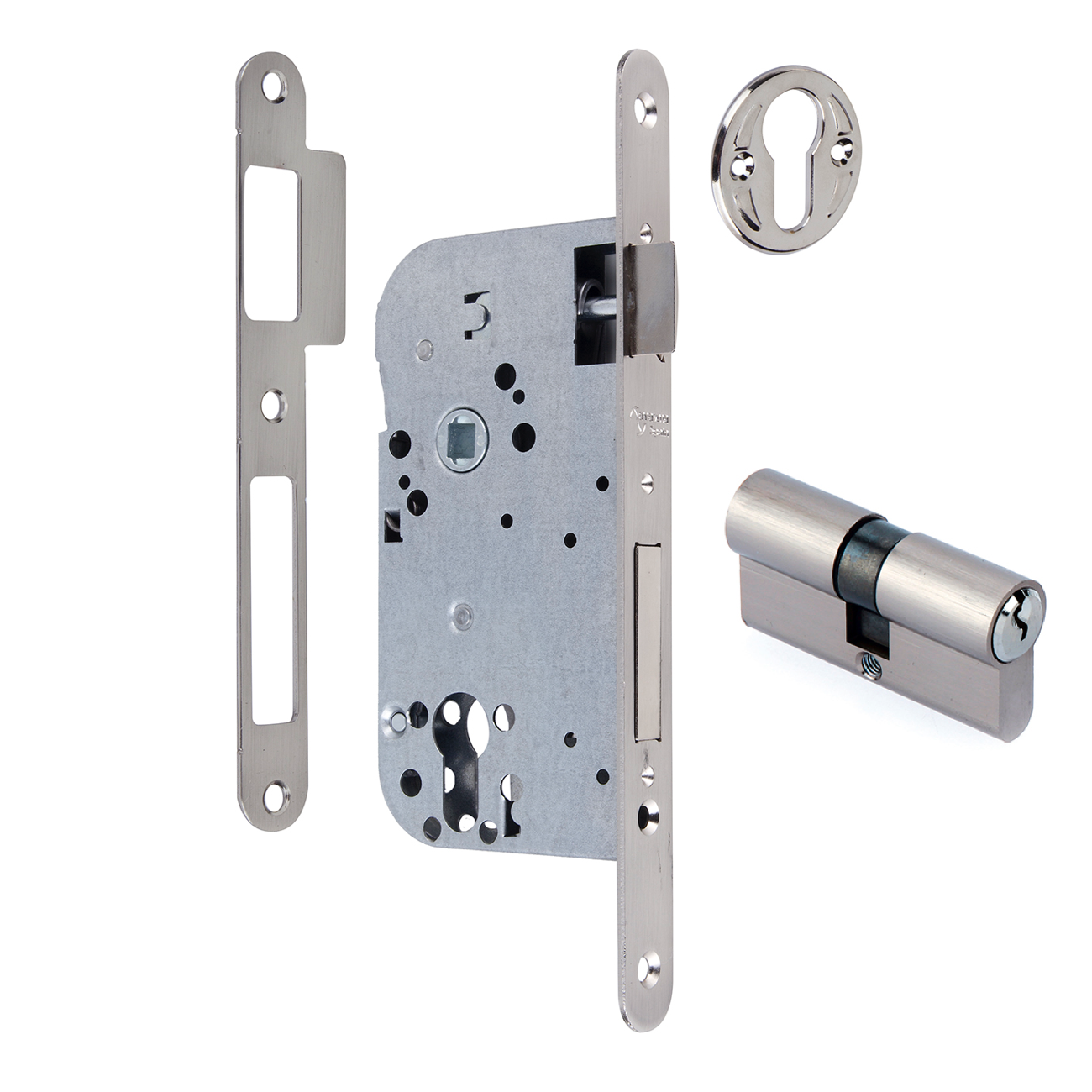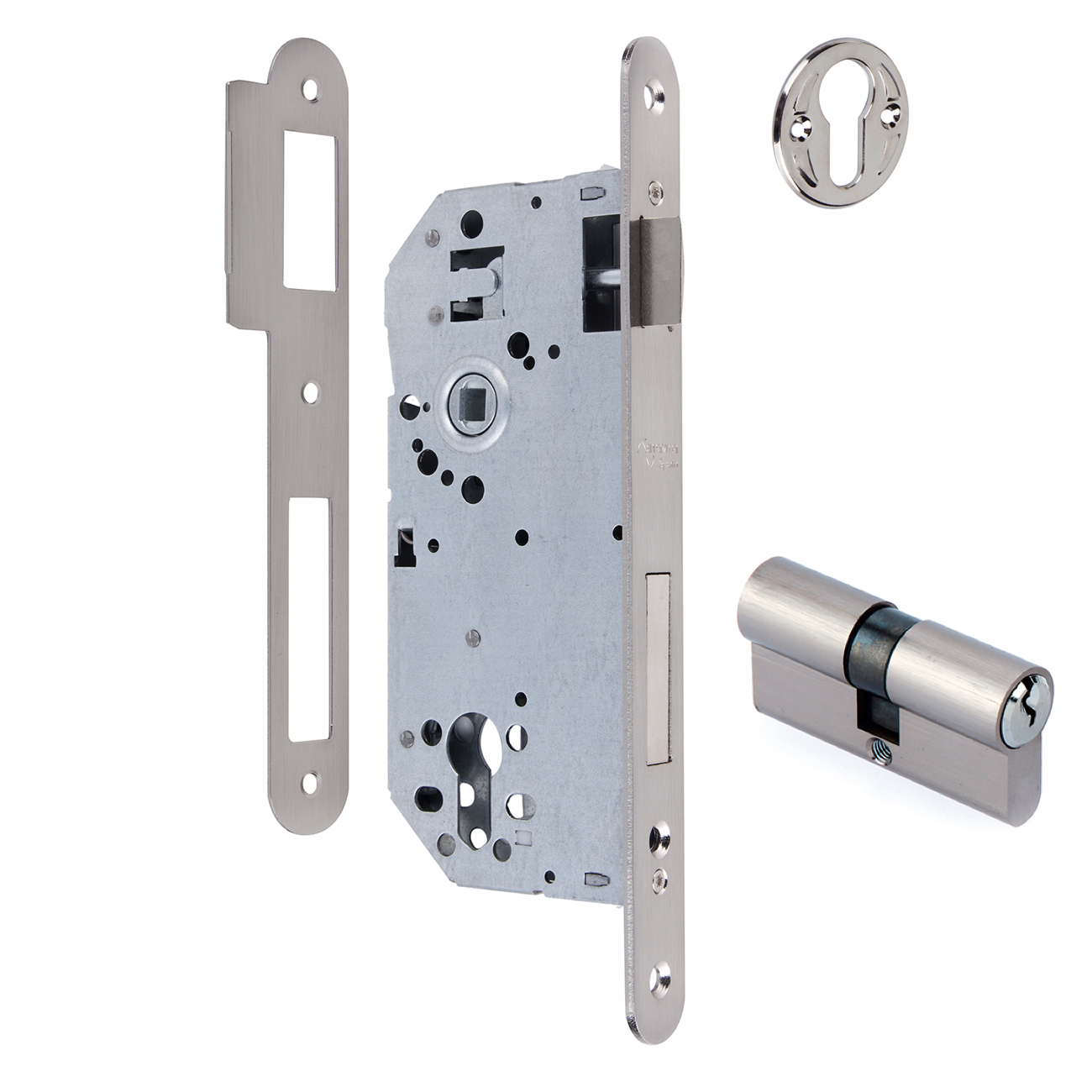Cerradura de embutir para cilindro Europeo. Picaporte reversible de acero cromado, para entrada de 50/60mm. Frente en canto redondo o recto. Tiene 85 mm entre ejes. Disponible...