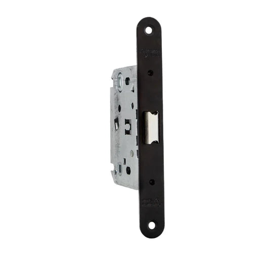 Cerradura de embutir para cilindro Europeo. Picaporte reversible de acero cromado, para entrada de 50/60mm. Frente en canto redondo o recto. Tiene 85 mm entre ejes. Disponible...